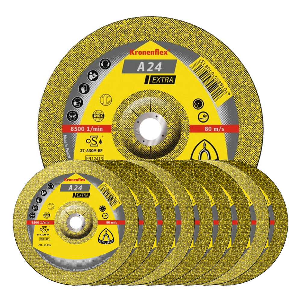 The Klingspor 4 1/2″ Metal Grinding Discs (10 Pack) —A24 Extra series—deliver aggressive stock removal and extended service life for professional metalworking. Designed with a depressed-centre profile and synthetic A24 abrasive grain , these 115 mm wheels excel in maintenance, fabrication, and plant construction. Certified to EN 12413 and oSa standards, they run safely at the specified maximum RPM and maintain high removal rates across steel, stainless, and general-purpose metals.