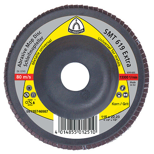 The Klingspor SMT 615 / 324 Extra 4½” Mop Disc Grit 60 (Pack of 10) is designed for professional-grade metalworking and surface finishing. Featuring a robust construction and grit 60 abrasiveness, it provides a perfect balance of material removal and surface refinement. These flap discs are ideal for applications such as polishing welds, cleaning metal surfaces, or prepping parts for painting or coating.